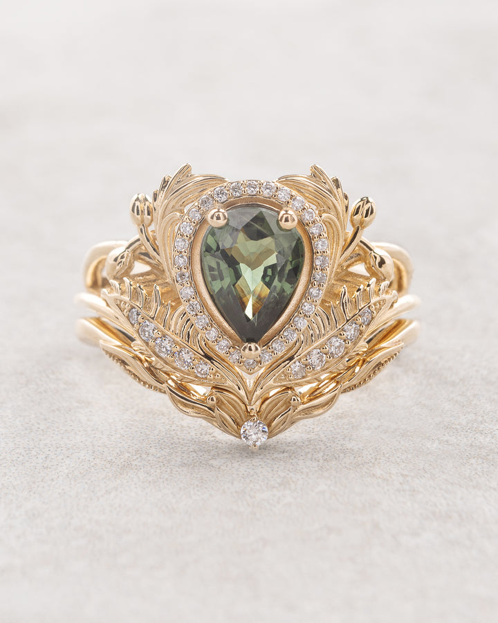Green sapphire bridal ring set with diamond halo / Adonis halo