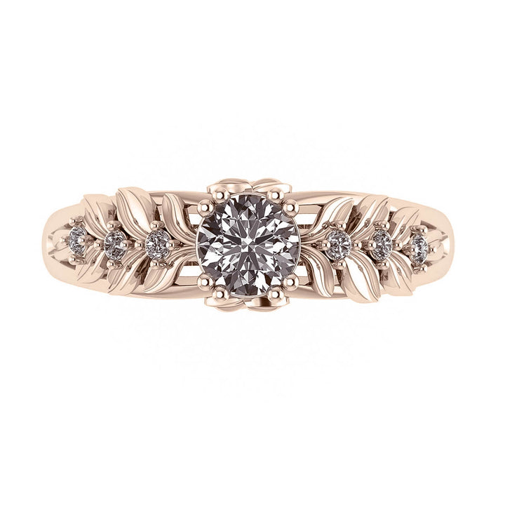 This unique engagement ring is made of solid gold with a round or cushion cut central gemstone and diamonds as accents. Nature ring features botanical design with detailed leaves and romantic mood with a touch of vintage inspired style.