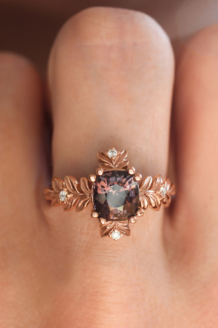 This unique engagement ring is made from solid gold and adorned with cushion cut purple spinel and natural diamonds. Nature ring features botanical design with crossed composition of detailed leaves and beautifully balanced colour scheme.