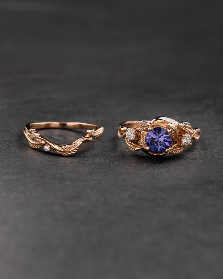 Purple tanzanite bridal ring set with golden leaves / Azalea
