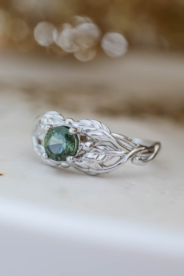 Natural green sapphire engagement ring, gold leaf ring / Tilia