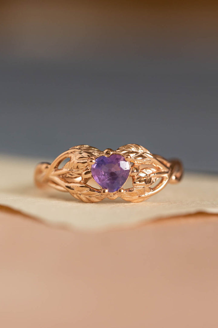 Our variation of Tilia style rings - shows detailed leaves skilfully wrapped around heart cut natural purple sapphire. This branch engagement ring is great for everyday wear and could be a perfect gift for nature lover.