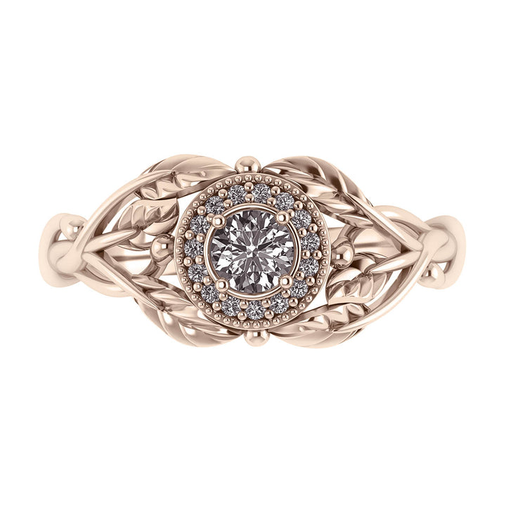 This halo engagement ring shows both classic and rustic style. Skilfully sculpted leaves of Tilia style ring look very realistic and hold setting with round cut gemstone.