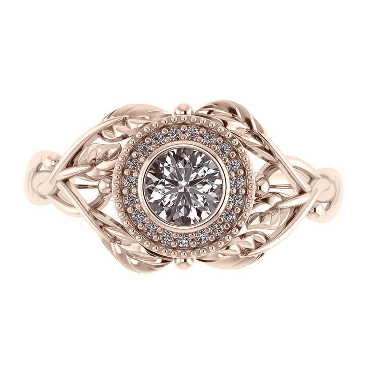 This halo engagement ring shows both classic and rustic style. Skilfully sculpted leaves of Tilia style ring look very realistic and hold setting with round cut gemstone.