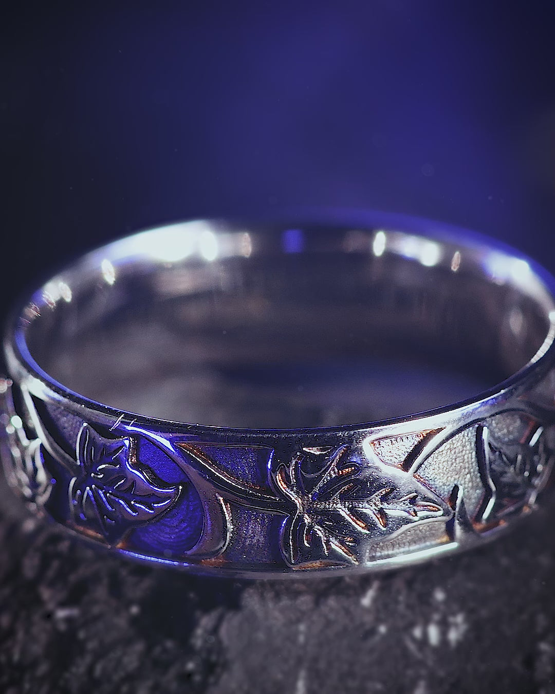 Original yet classic this nature wedding band will be a great choice for person who look for comfortable ring to wear everyday. Features ivy leaves pattern created by an artist. To make a contrast look we used black rhodium plating and it gives a modern and stylish twist to a traditional wedding band.