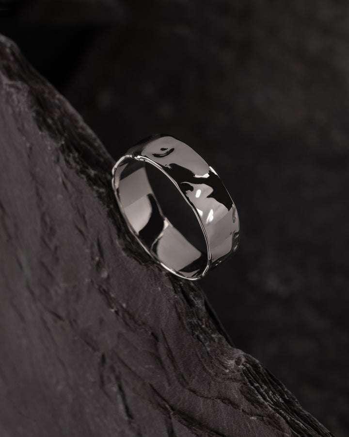 This man's band has a wide profile with a unique texture of naturally melted metal. It has an original yet minimal look, great for those who're looking for a stylish wedding ring suitable for everyday wear. It will be made in the requested size and desirable gold colour.