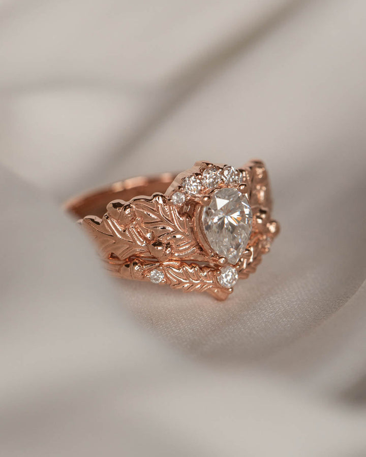 We love oak leaf shapes and have made this ring set as the most well-dressed ring from our oak collection. Central pear cut gemstone has a gemstone crown which really makes it looking like a royal piece. Highly detailed oak tree leaves are arranged around the central gemstone and tiny acorns will amaze her with cuteness and high quality work.