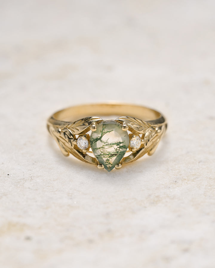 This Wisteria engagement ring features pear cut natural green moss agate. Unique proposal ring is adorned with two accent diamonds.