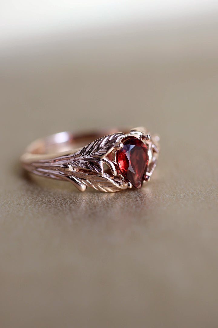 Leaf engagement ring with pear cut garnet
