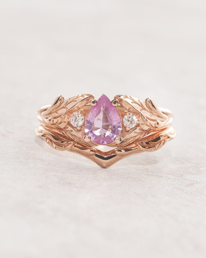 Natural pink sapphire and diamonds bridal ring set / Wisteria