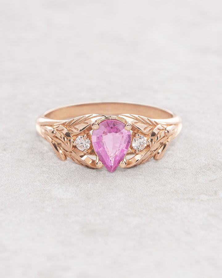 This Wisteria engagement ring features pear-cut natural pink sapphire. Unique proposal ring is adorned with two accent lab-grown diamonds.