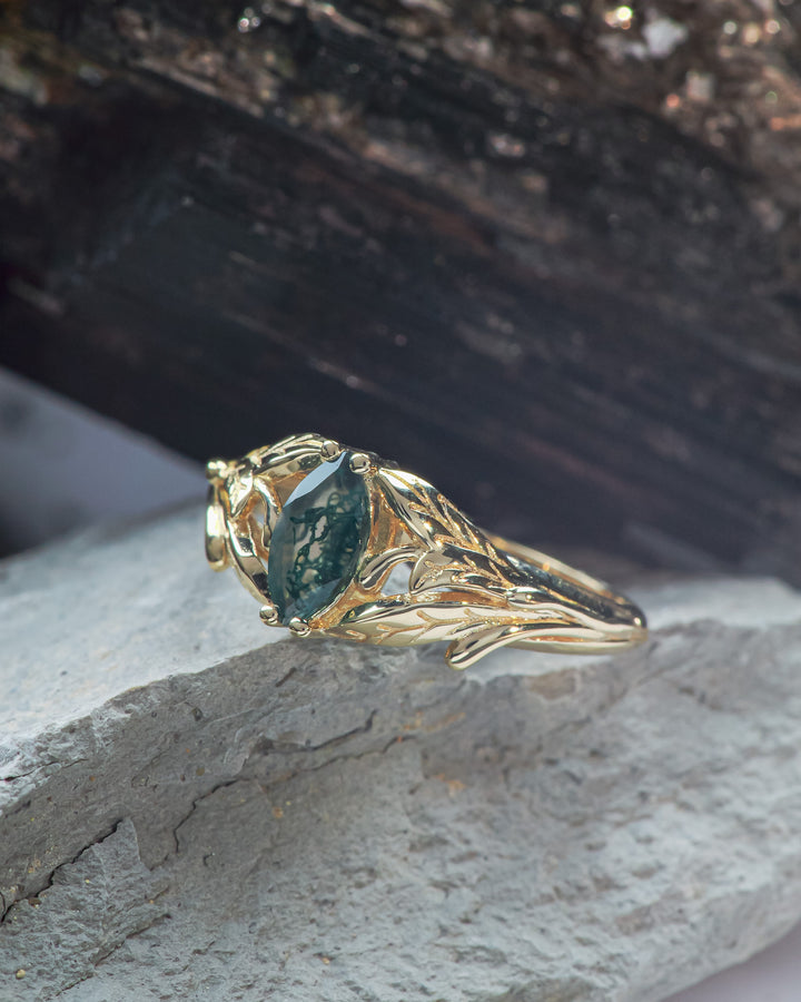 Moss agate engagement ring, gold ring with marquise cut gemstone