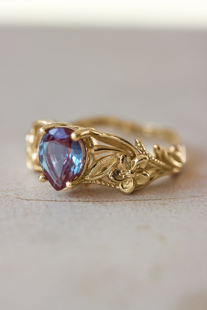 Eloise engagement ring is made from solid gold and adorned with lab created alexandrite. Romantic design shows flowing lines, flowers and leaves. Inspired by art nouveau style this unique ring will impress by it's delicate details and sophisticated design. Perfect gift for those women who admire floral jewelry and prefer timeless style.