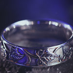 Original yet classic this nature wedding band will be a great choice for person who look for comfortable ring to wear everyday. Features ivy leaves pattern created by an artist. To make a contrast look we used black rhodium plating and it gives a modern and stylish twist to a traditional wedding band.