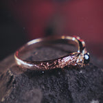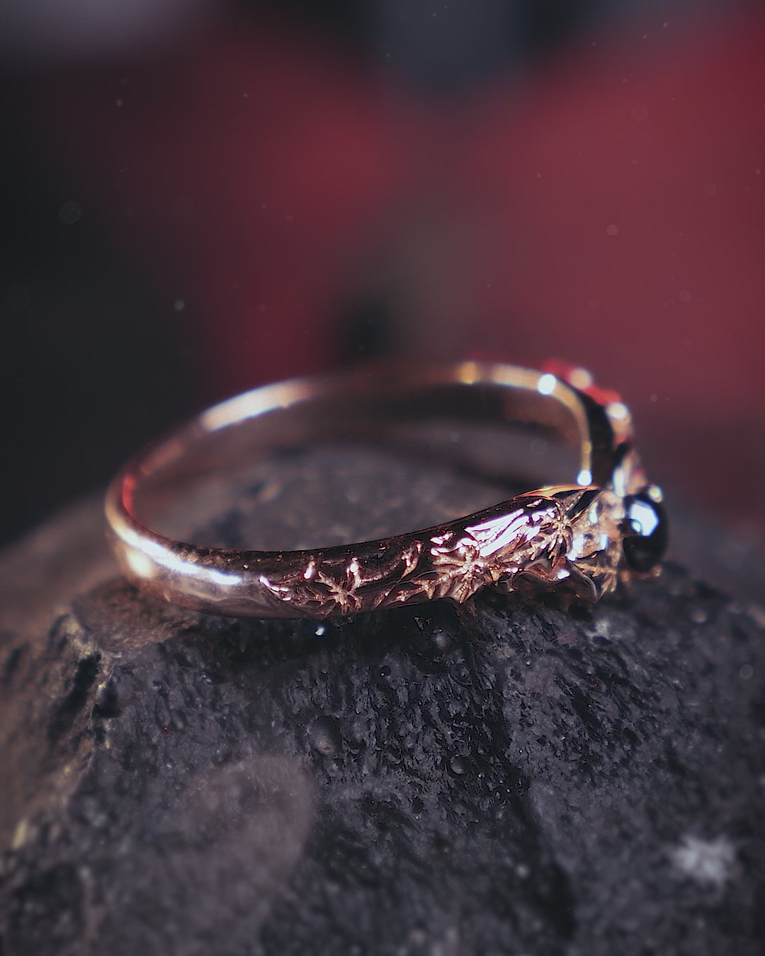 Gold leaf wedding band with black diamond, ivy leaves ring