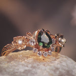 Adelina ring shows sophisticated style with central pear cut gemstone, two flowers adorned with lab or natural diamonds and delicate leaves.