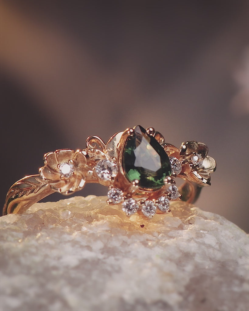 Green sapphire and diamonds ring, flower engagement ring / Adelina - Eden Garden Jewelry™