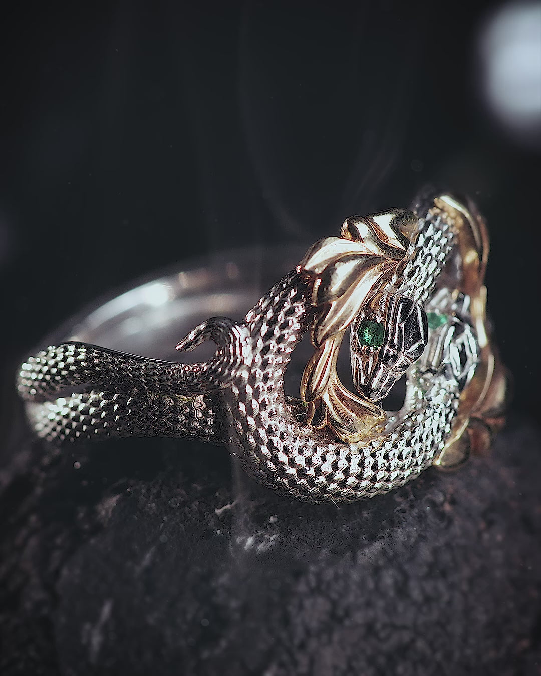 Ring of Barahir in two tone gold, snakes ring with emeralds - Eden Garden Jewelry™