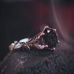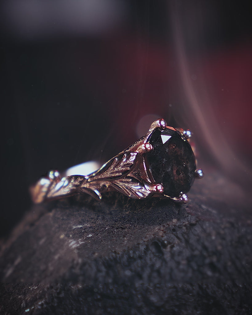 Salt and pepper diamond engagement ring, gold leaves engagement ring
