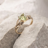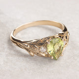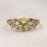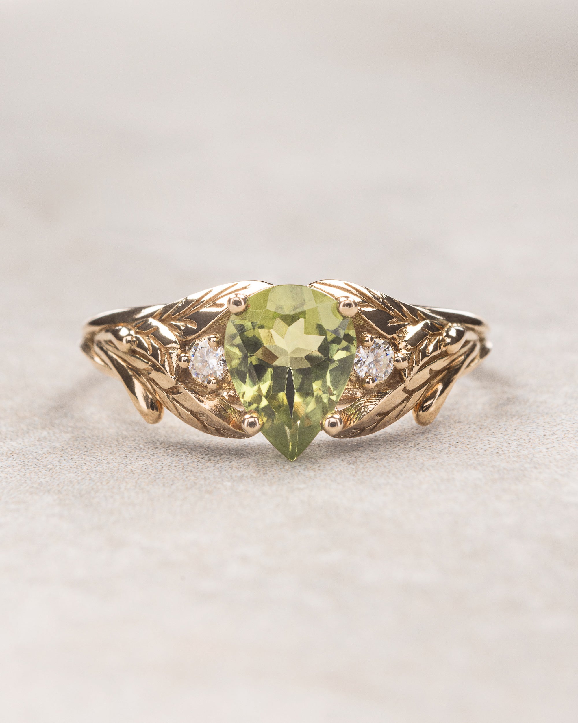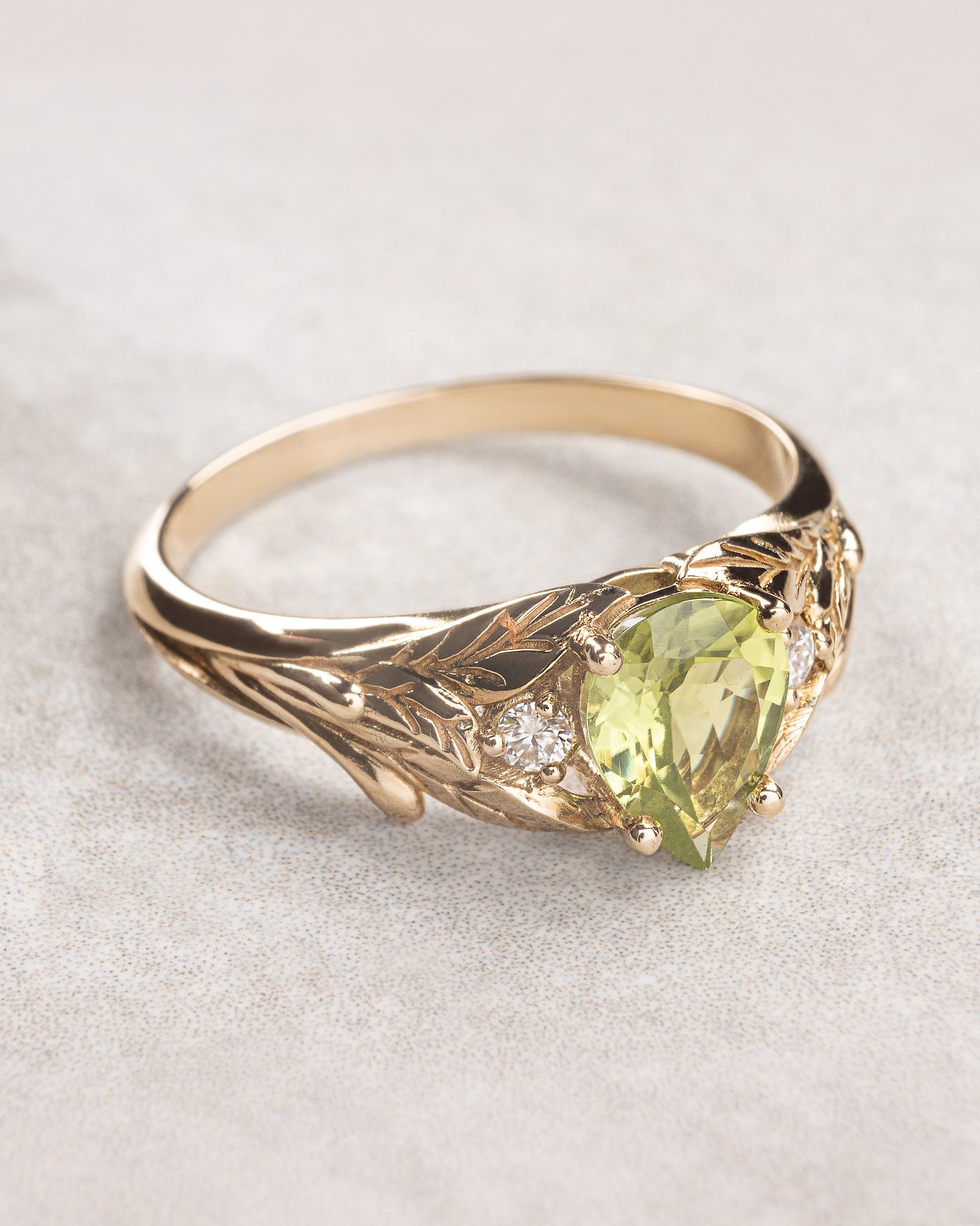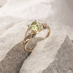 The nature inspired engagement ring features a botanical design with detailed leaves wrapping around the central gemstone. It has a romantic mood with a touch of vintage inspired style.
