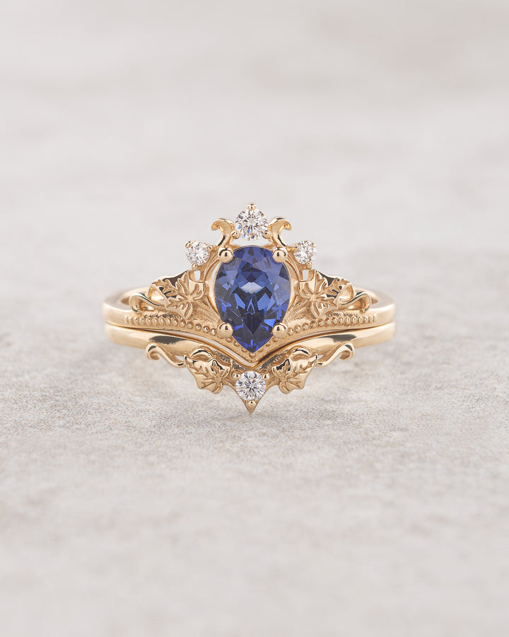 Magnificent wedding ring set features nature inspired style with tiny ivy leaves and the most delicate details you can imagine. This version comes with pear cut gemstone - vivid blue lab sapphire. It will be a great choice for those looking for untraditional yet elegant and timeless engagement ring.