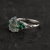 Natural moss agate & accent lab emeralds engagement ring / Gloria