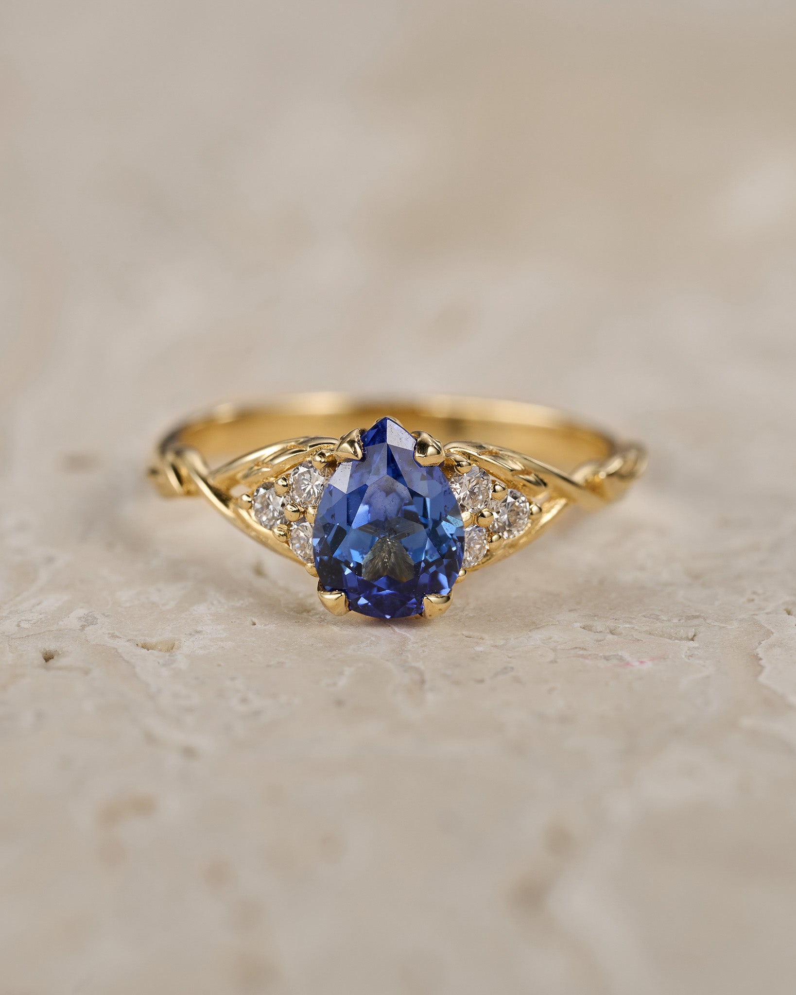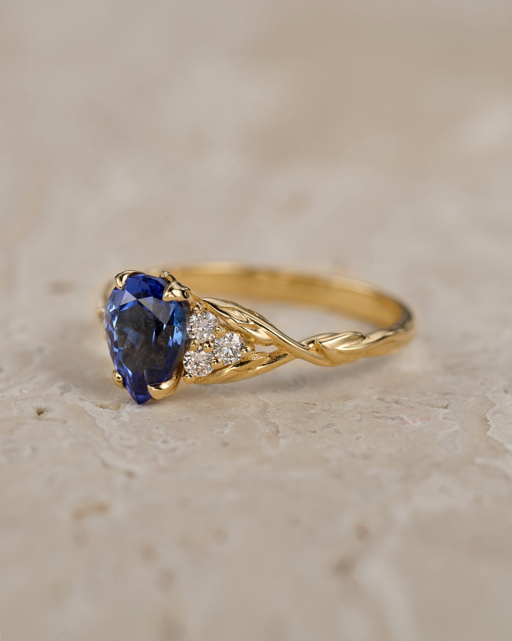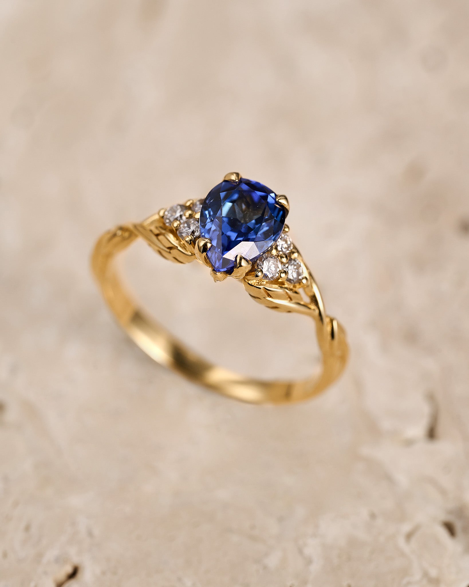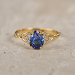 Gloria engagement ring features an elegant and modern pear-cut gemstone with a combination of a dainty leaf band. Side lab-grown diamonds create a triangle on each side of the central gemstone and add an extra sparkle. A great choice for those looking for an engagement ring with a minimalistic look, yet a nature-inspired style. It looks complementary on any hand, thanks to the vertical position of the central gemstone.
