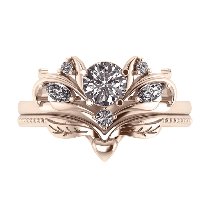 Magnificent Swanlake wedding ring set features nature-inspired style complimented with a tiny winged heart underneath. Adorned with central round cut gemstone it has marquise cut accent gemstones looking like petals or buds.