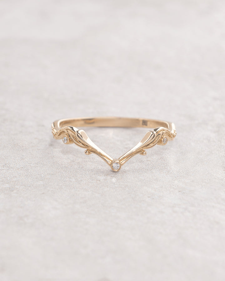 Delicately curved wedding band shows alternative chevron ring style. Designed especially to stack with our art nouveau Callisto engagement ring, it could be used as as a single dainty band as well. This version has three diamonds which give a lovely accent and a complete look.