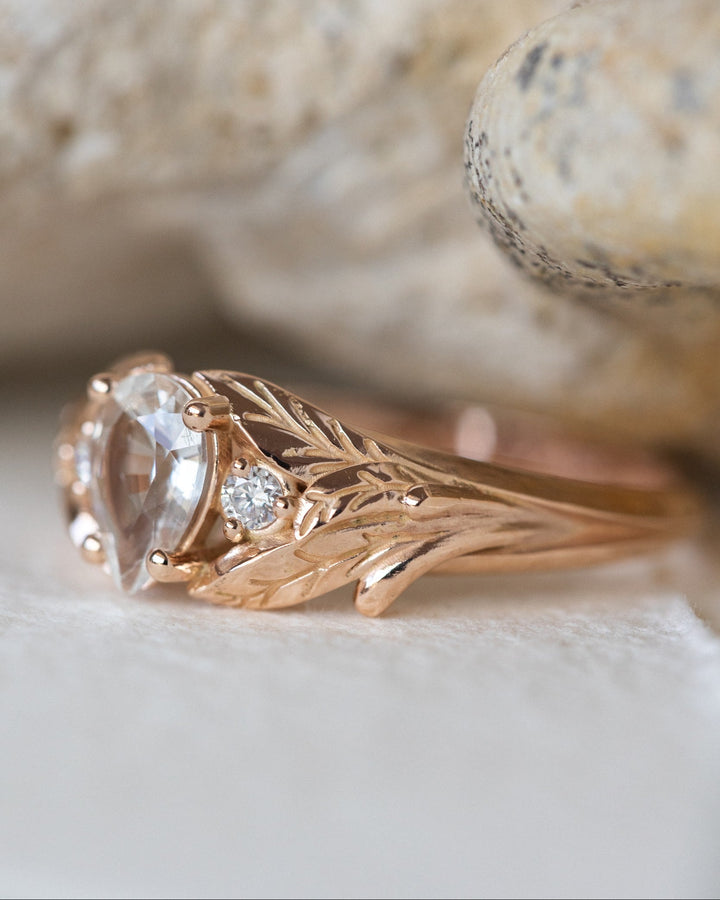 READY TO SHIP Wisteria ring in 14K rose gold, natural white sapphire pear cut 7x5 mm, accent natural diamonds, AVAILABLE RING SIZES: 5.5 - 8.5 US