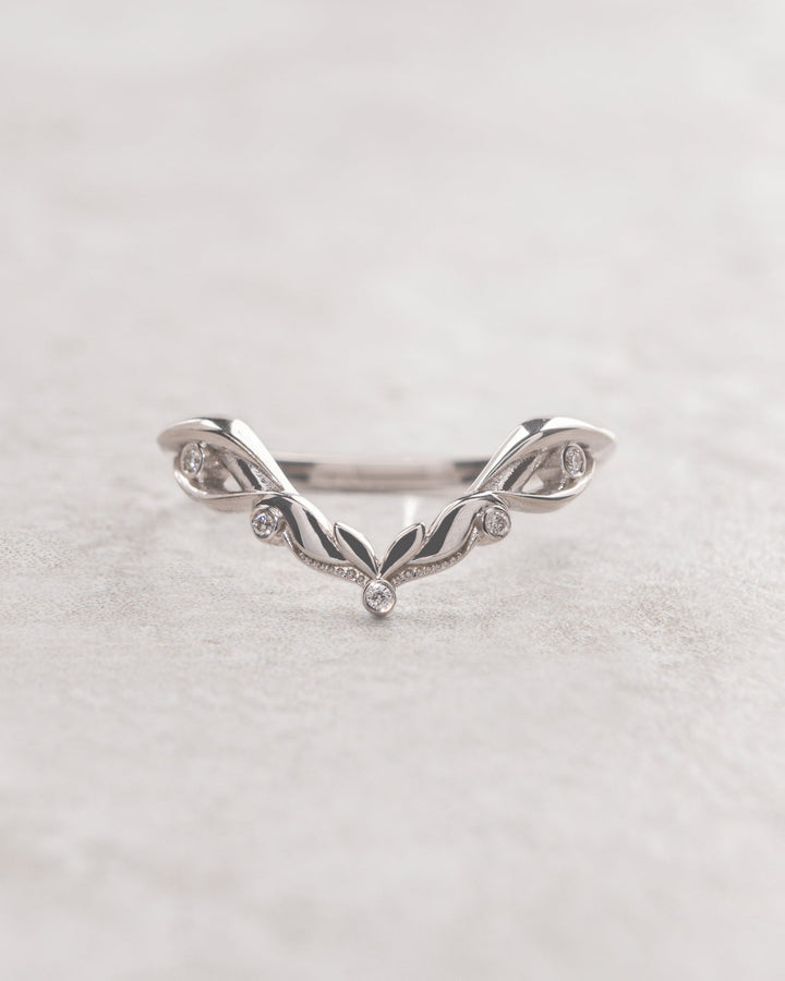 This nature-inspired wedding band is a dainty jewelry piece but sturdy enough for everyday wear. It features a minimalistic leaf design with tiny gemstones.