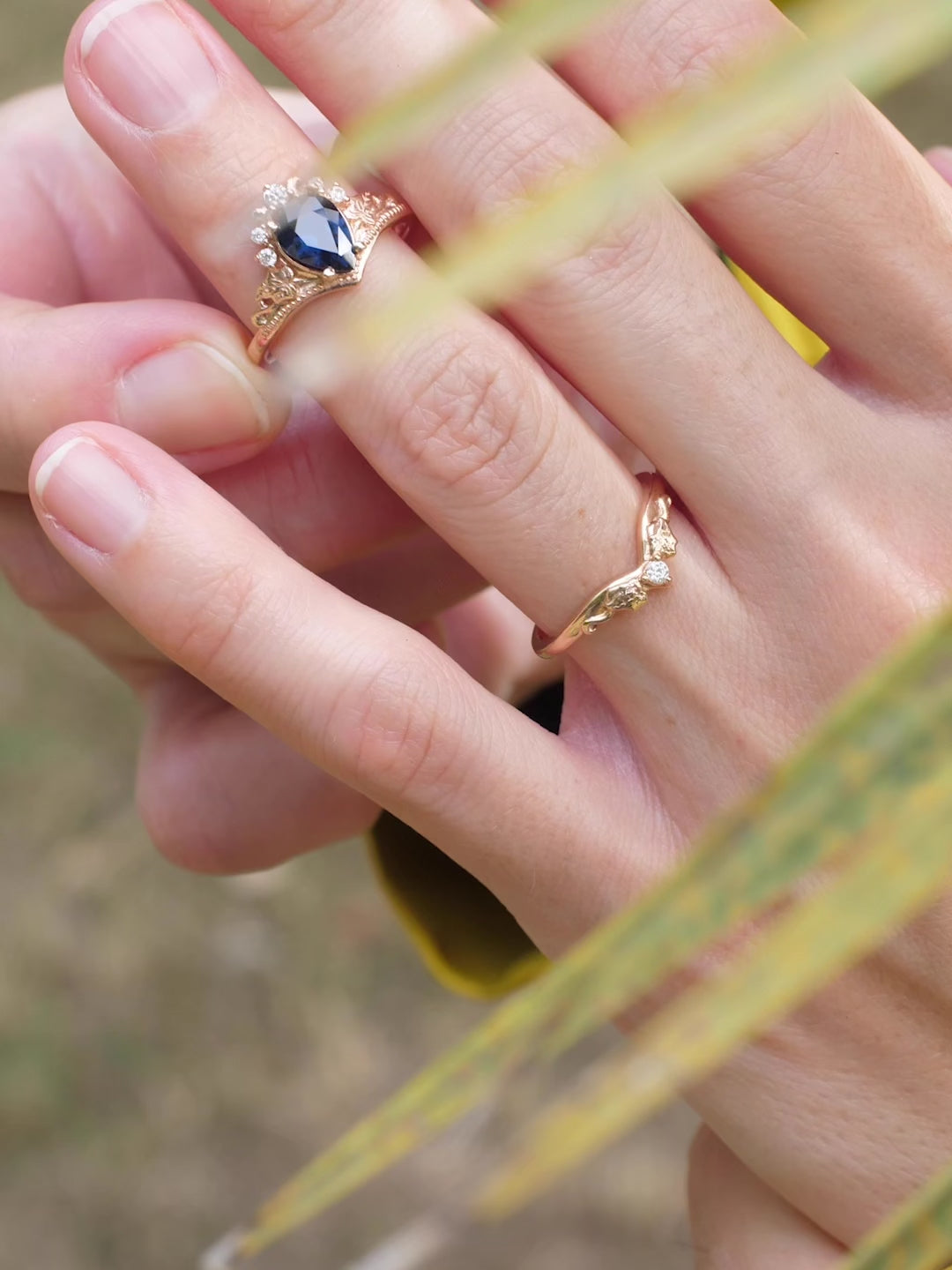 Magnificent wedding ring set features nature inspired style with tiny ivy leaves and the most delicate details you can imagine. This version comes with pear cut gemstone - natural blue sapphire. Deep blue colour is complimented with lab grown or natural sparkling diamonds.