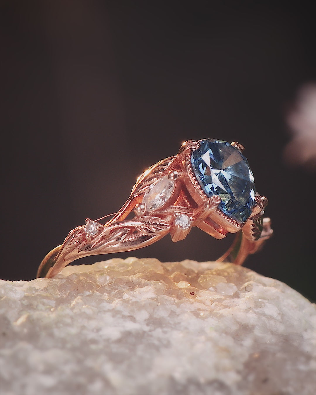 Patricia ring shows intricate design with vines and leaves interlacing in a natural way. Side gemstones are scattered between twigs - marquise cut gemstones remind leaf shapes, and small round cuts look like shiny morning dew. Central gemstone has a beaded frame around it, which adds extra detail.