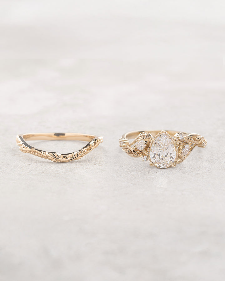 Lab grown diamond bridal ring set, nature engagement ring with twig wedding band / Patricia