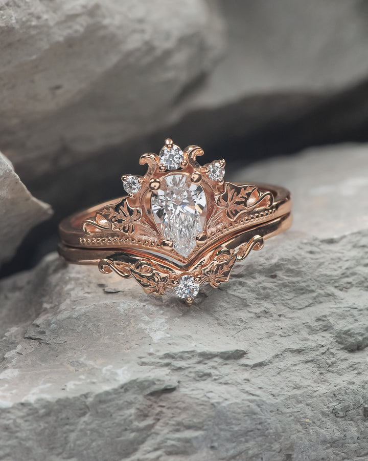 READY TO SHIP: Ariadne bridal set in 18K rose gold, pear cut lab grown diamond 7x5 mm, accents lab grown diamonds, RING SIZE: 5.5 - 8.5 US US - Eden Garden Jewelry™