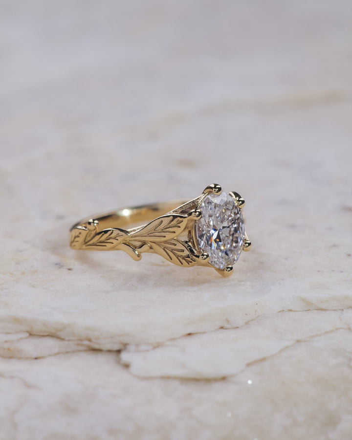 Lab grown diamond leaf engagement ring, oval cut gemstone proposal ring