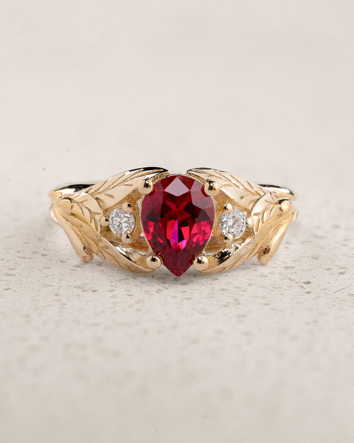Leafy Engagement Ring with Pear-Cut Ruby & Diamonds / Wisteria