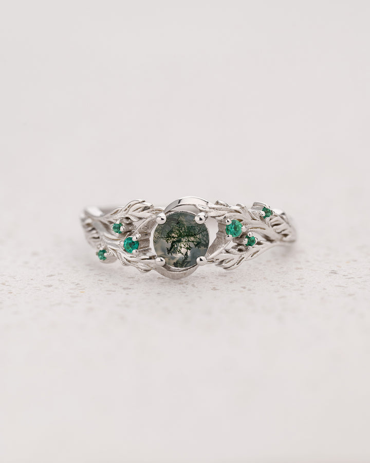 READY TO SHIP: Japanese Maple engagement ring with moss agate and emeralds, 14K white gold, AVAILABLE RING SIZES: 5.5 - 8.5 US - Eden Garden Jewelry™