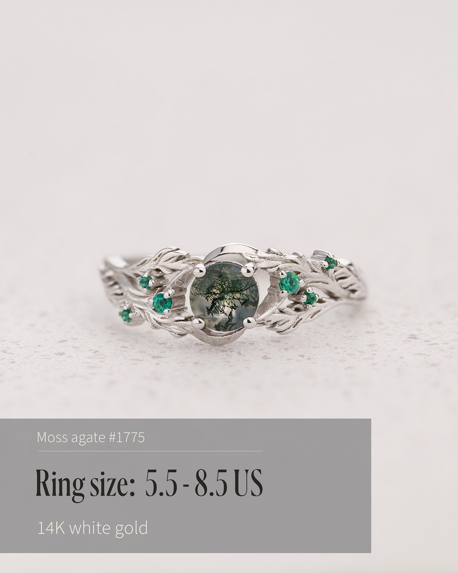 READY TO SHIP: Japanese Maple engagement ring with moss agate and emeralds, 14K white gold, AVAILABLE RING SIZES: 5.5 - 8.5 US