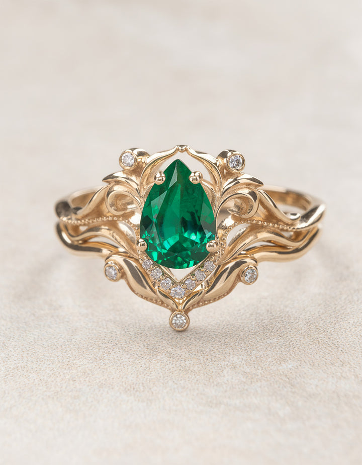 Exceptionally delicate, this bridal set is inspired by art nouveau style. Pear cut gemstone is surrounded by stylised flowers and adorned with sparkling diamonds. Lab emerald has a magnificent colour, flawless clarity and high durability.