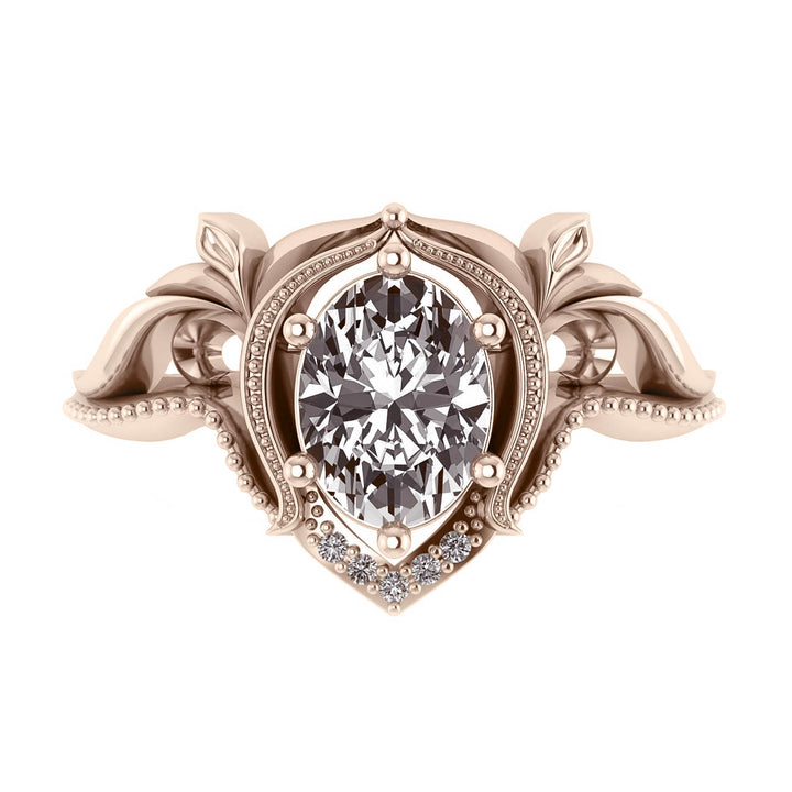 The vintage-inspired Lida engagement ring features sophisticated style and a timeless look. Art nouveau stylized flowers wrap around central oval cut gemstone and accent stones add charming sparkle. Magnificent proposal ring shows the highest quality fine jewelry craftsmanship you can imagine. We're proud of this design: its balanced composition, delicate yet sturdy details make the ring perfect for everyday wear and years to come.
