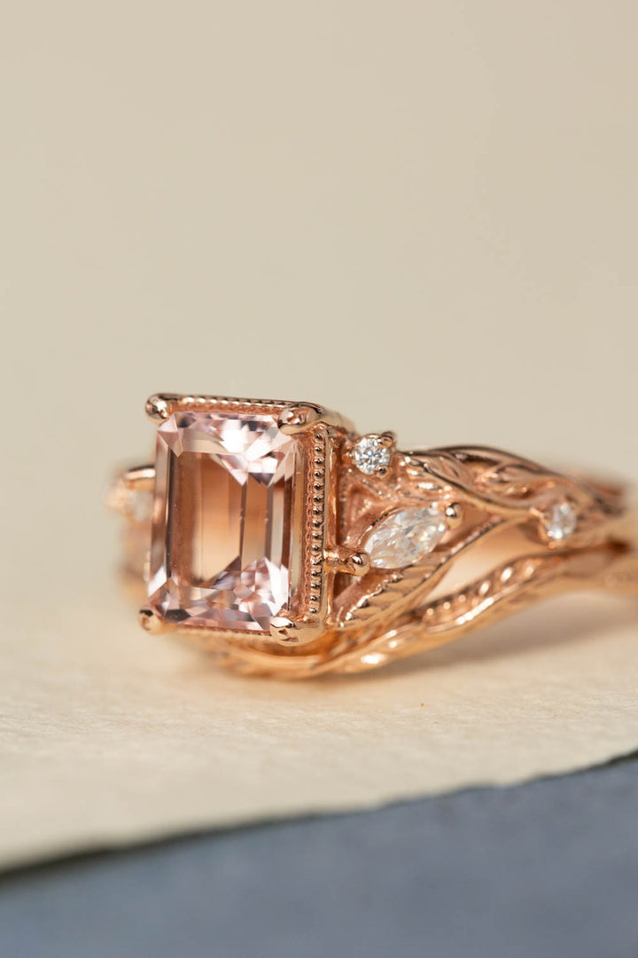 Morganite engagement ring set, emerald cut gemstone bridal ring set
