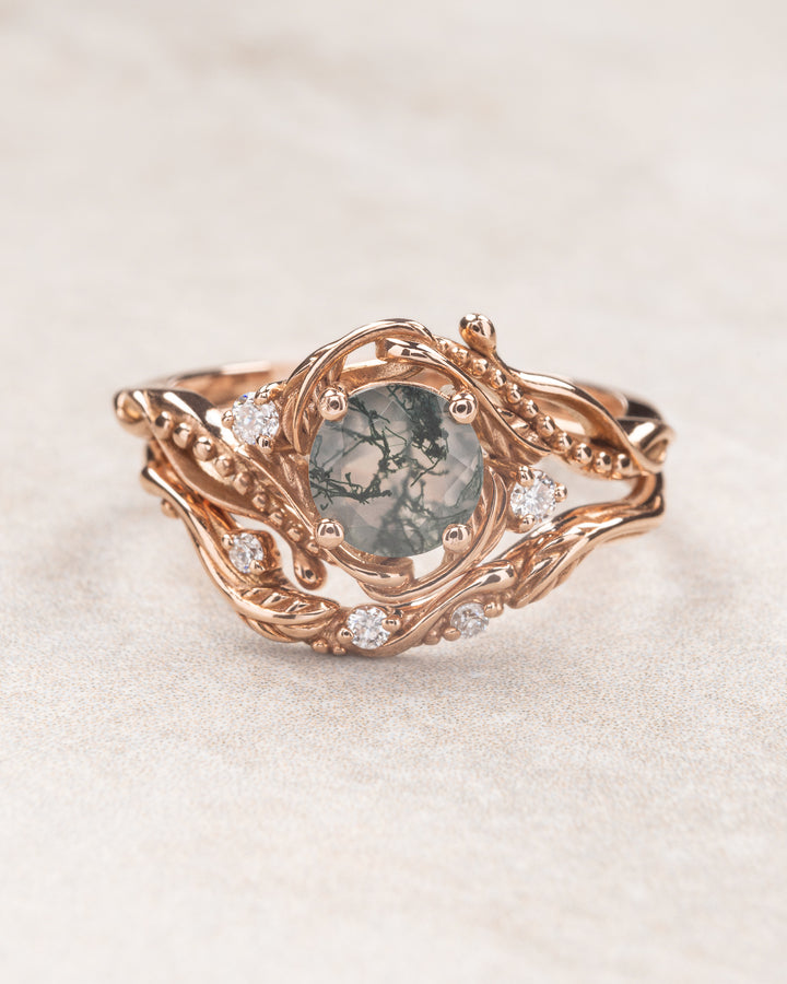 Bridal ring set in rose gold with natural round moss agate and accent diamonds / Undina