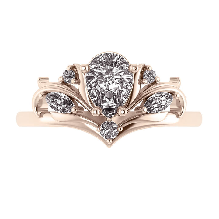 Magnificent Swanlake engagement ring features nature-inspired style complimented with a tiny winged heart underneath. Adorned with central pear cut gemstone it has marquise cut accent gemstones looking like petals or buds.