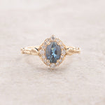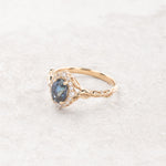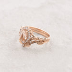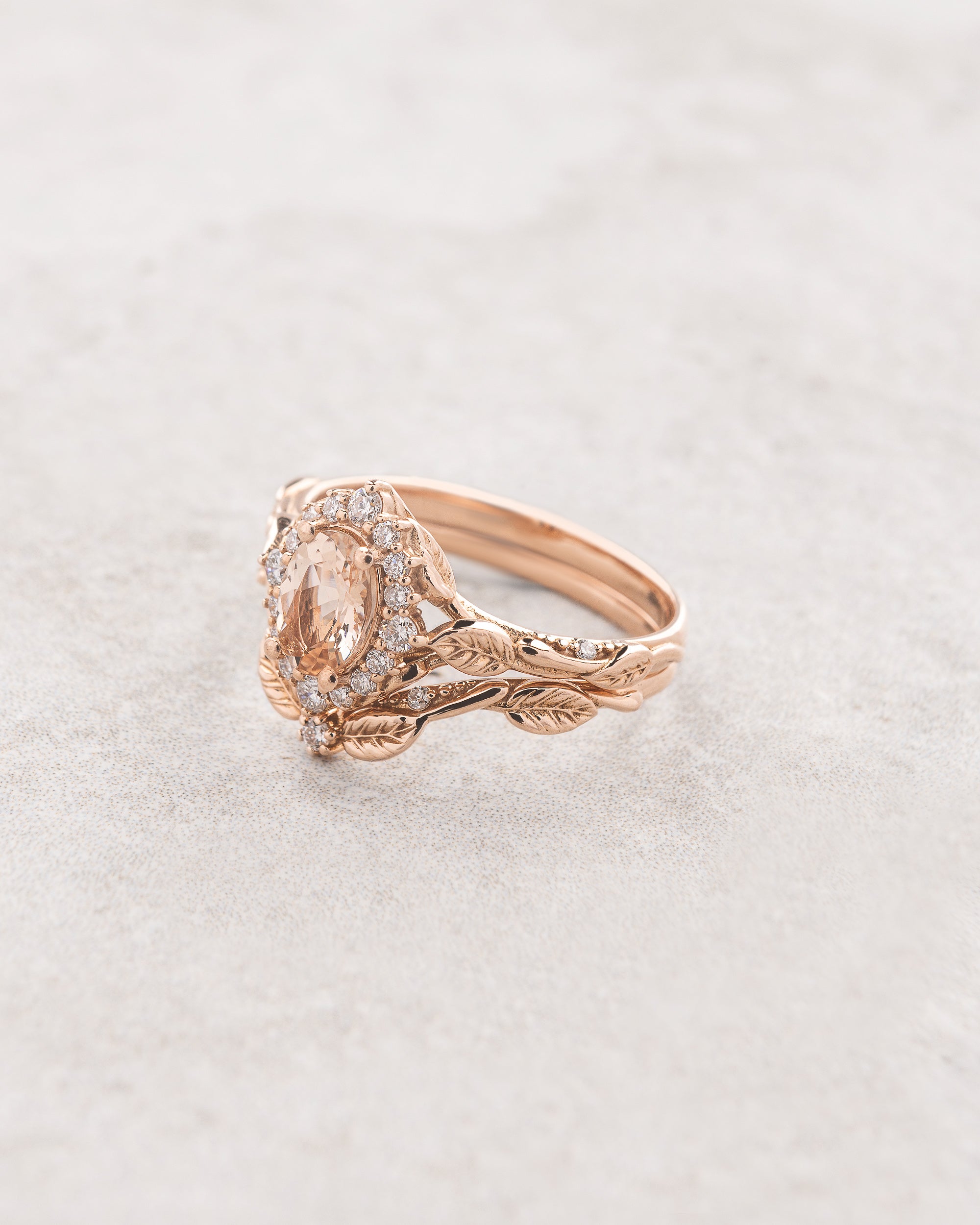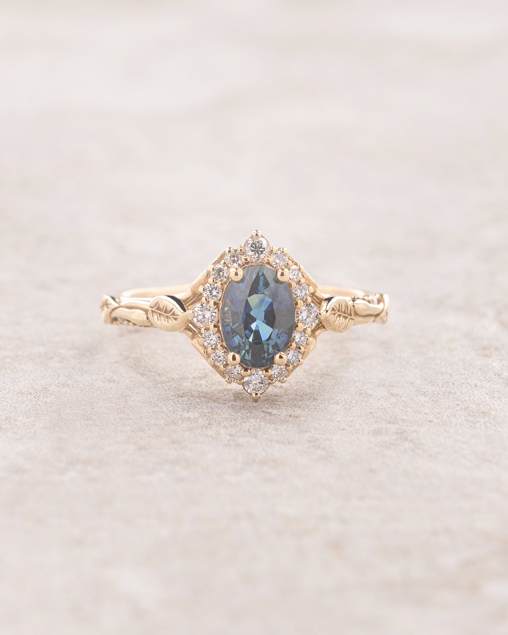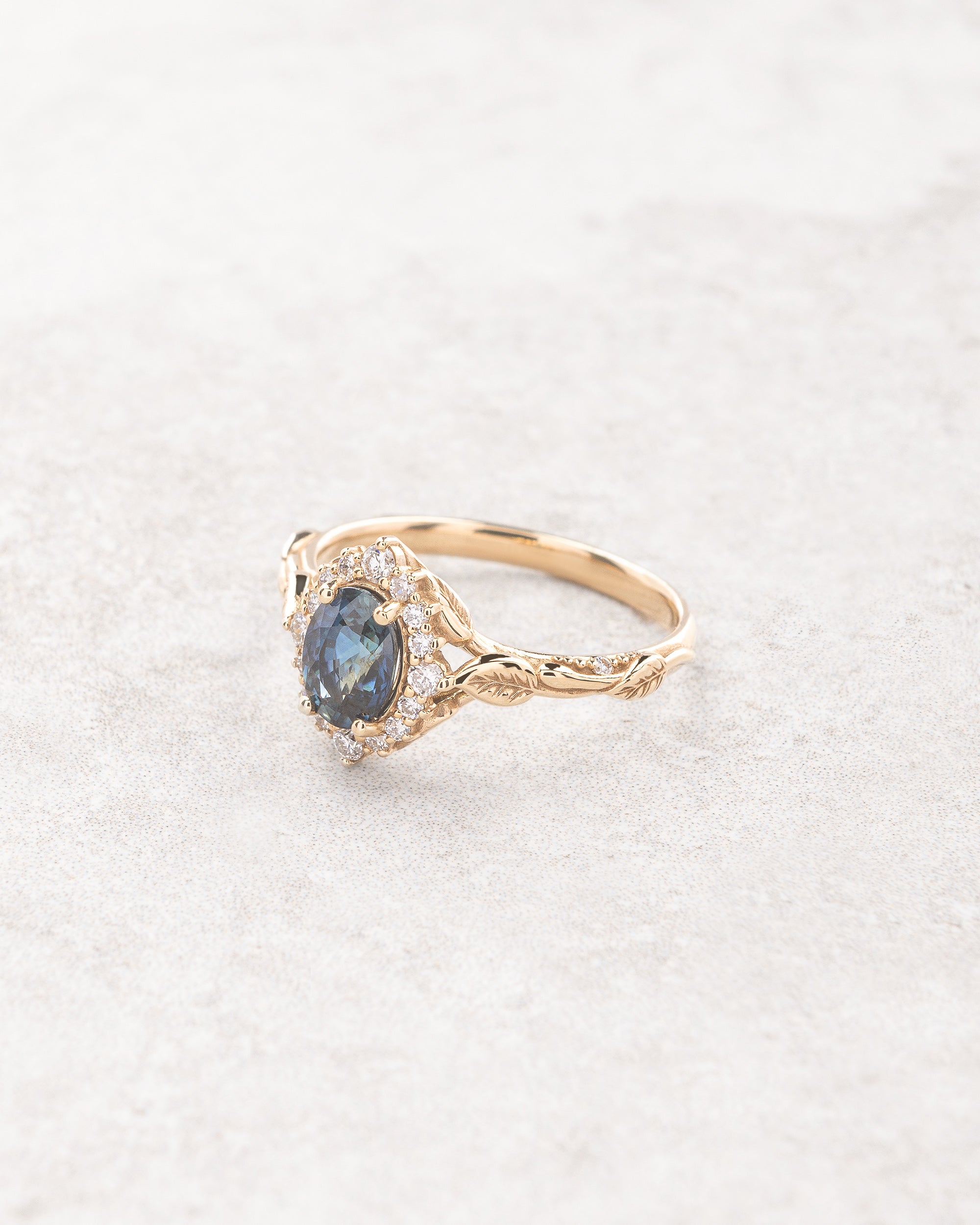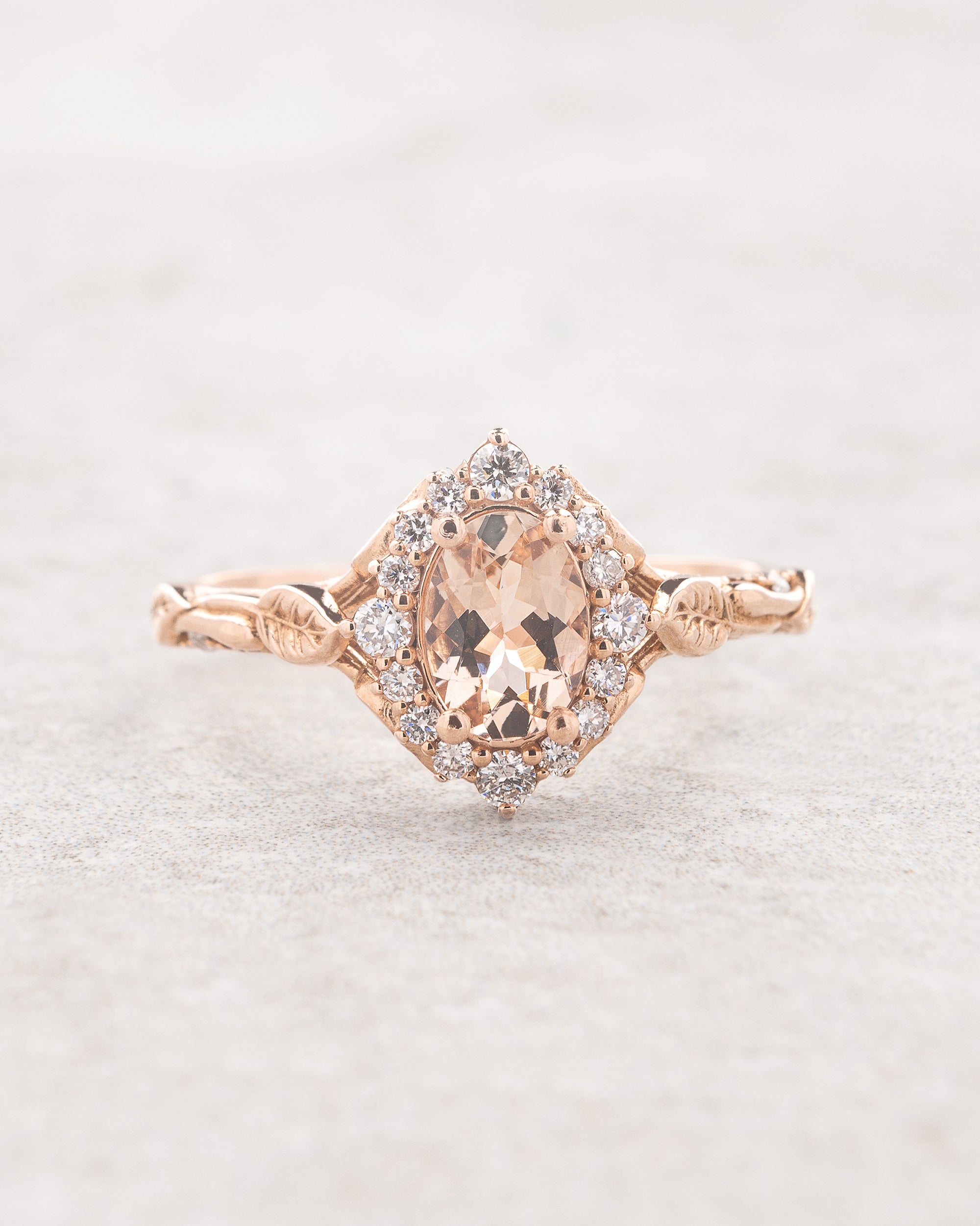 We named this ring Florentina - it comes from the Roman name Florentius, which was from the Latin word florens, meaning "to bloom". The central gemstone, surrounded by a rich diamond halo, is set on a delicate branch and surrounded by lovely petals - this composition is reminiscent of a flower bud, and the leaf shapes are inspired by rose vines.