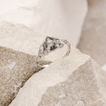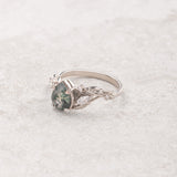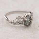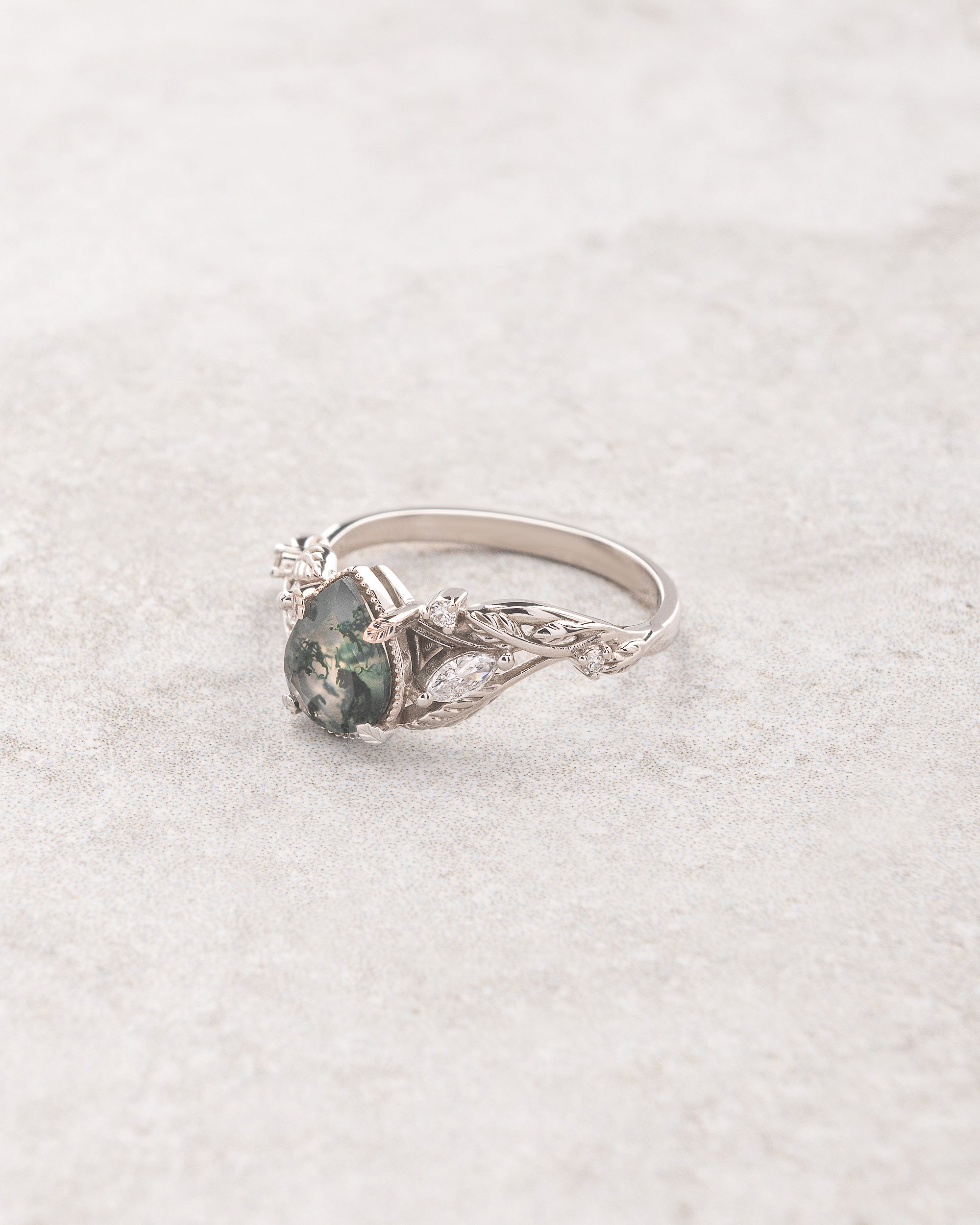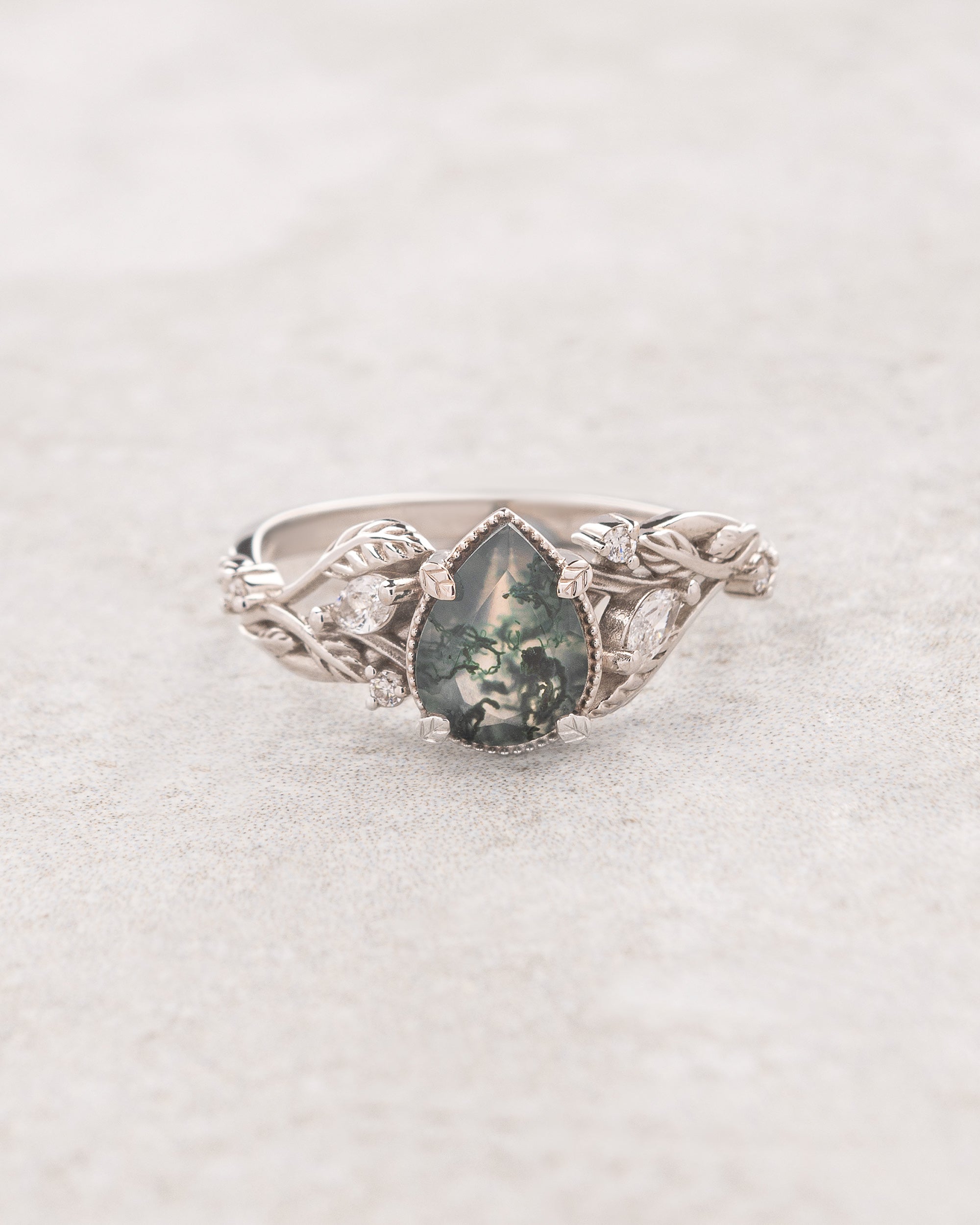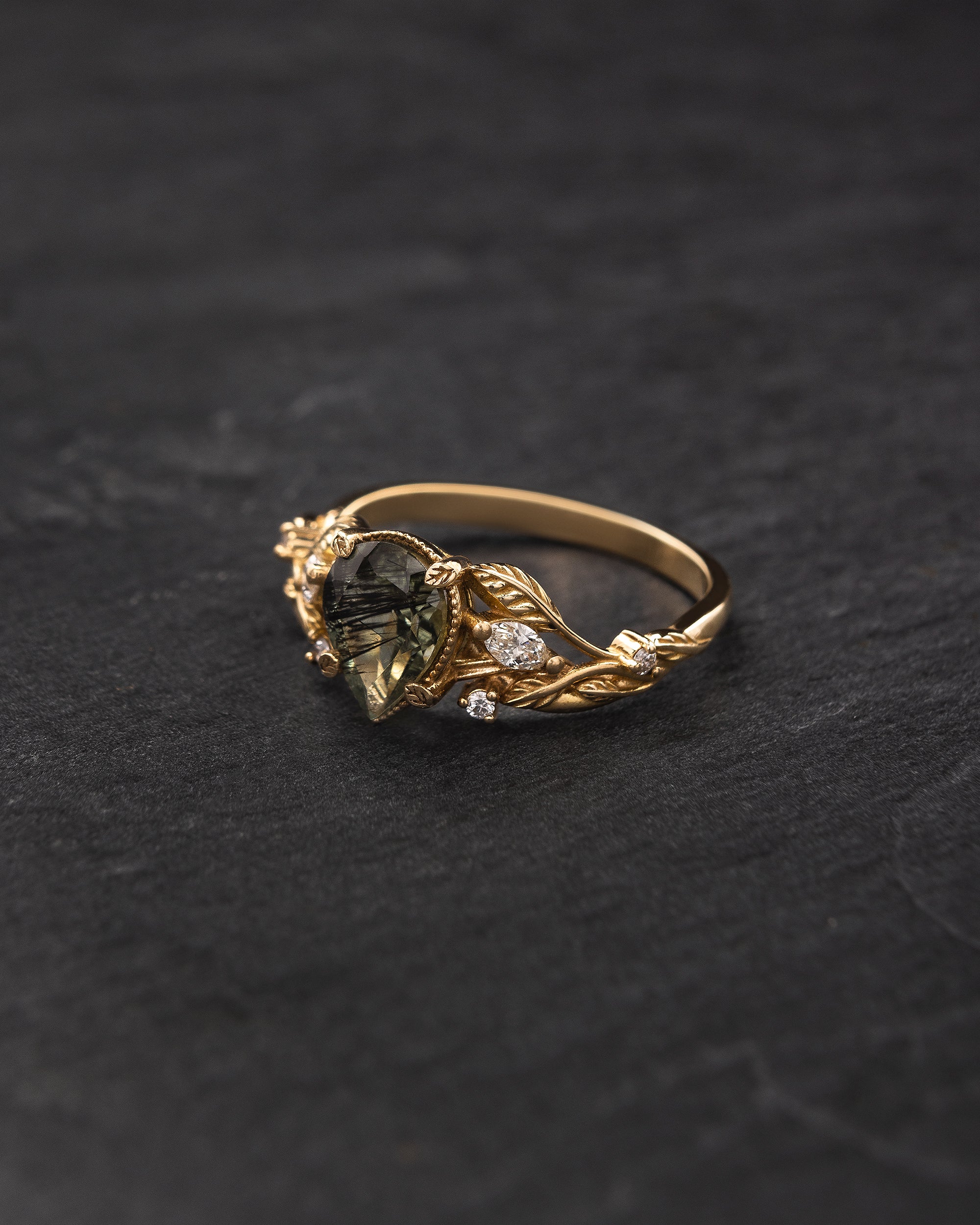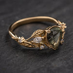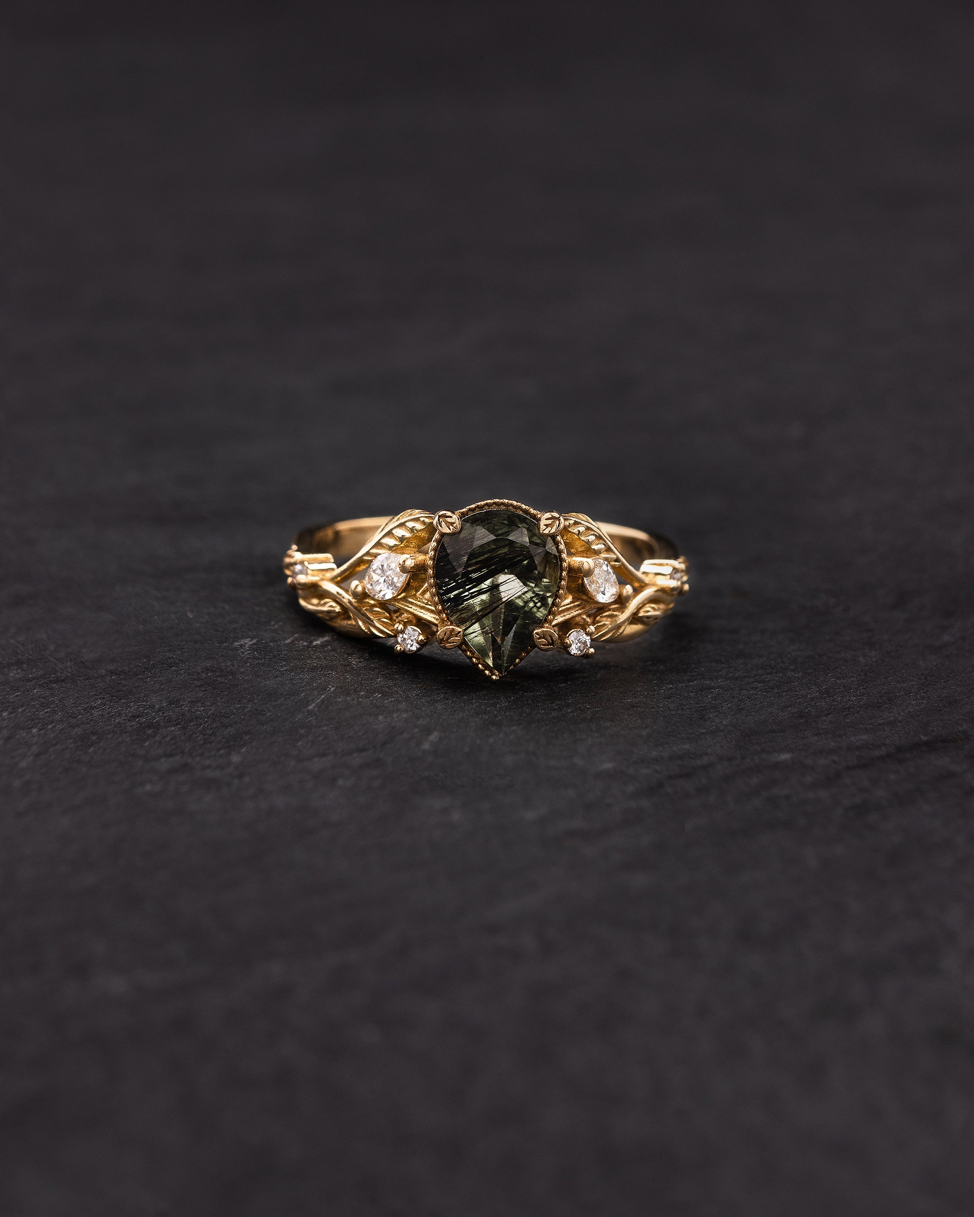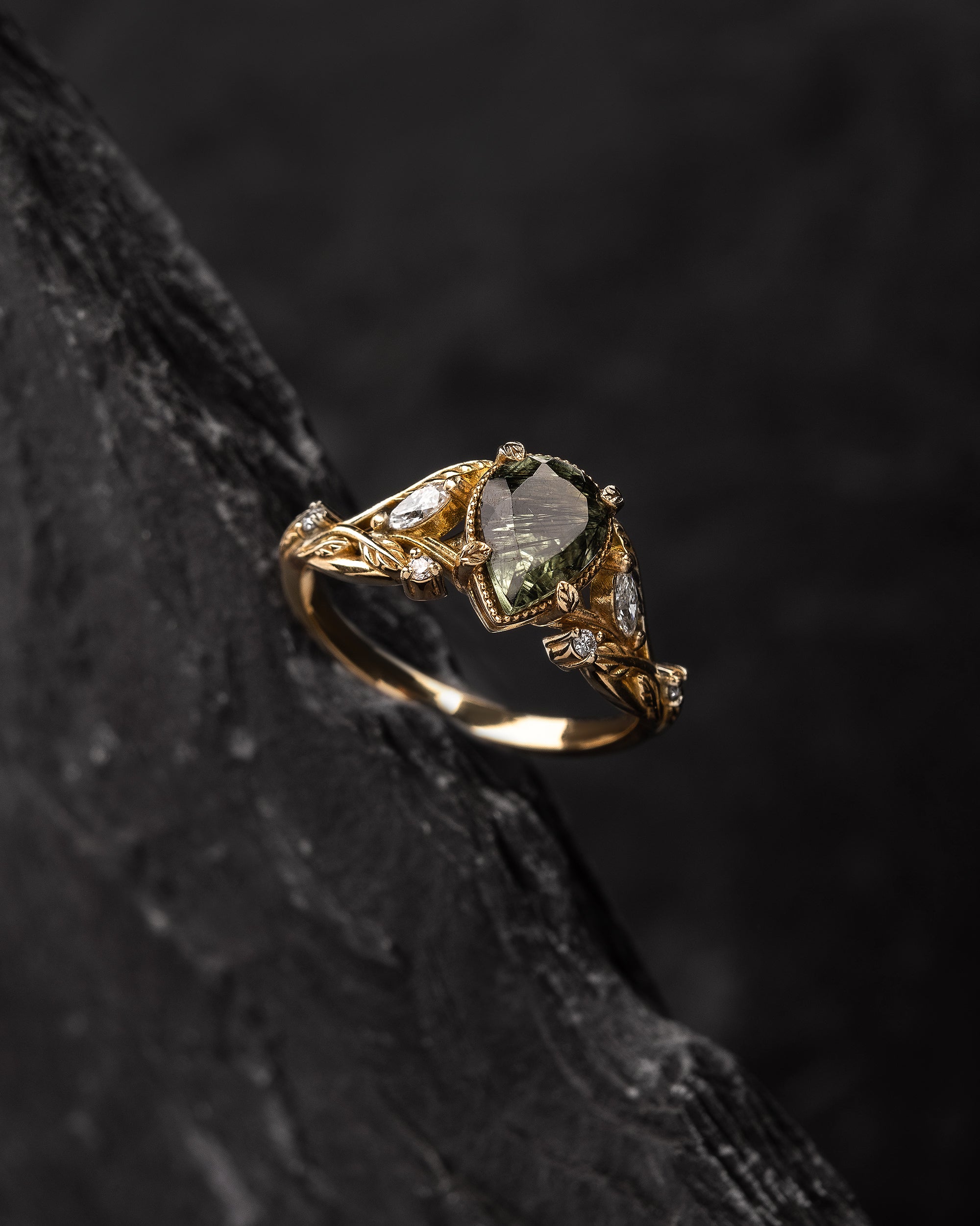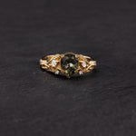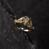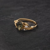 The asymmetrical Patricia ring shows an intricate design of vines and leaves that weave together in a natural way. Side gemstones are scattered between the twigs - marquise cut gemstones resemble leaf shapes and small round cuts look like shiny morning dew. The central gemstone has a beaded frame around it, adding extra detail.