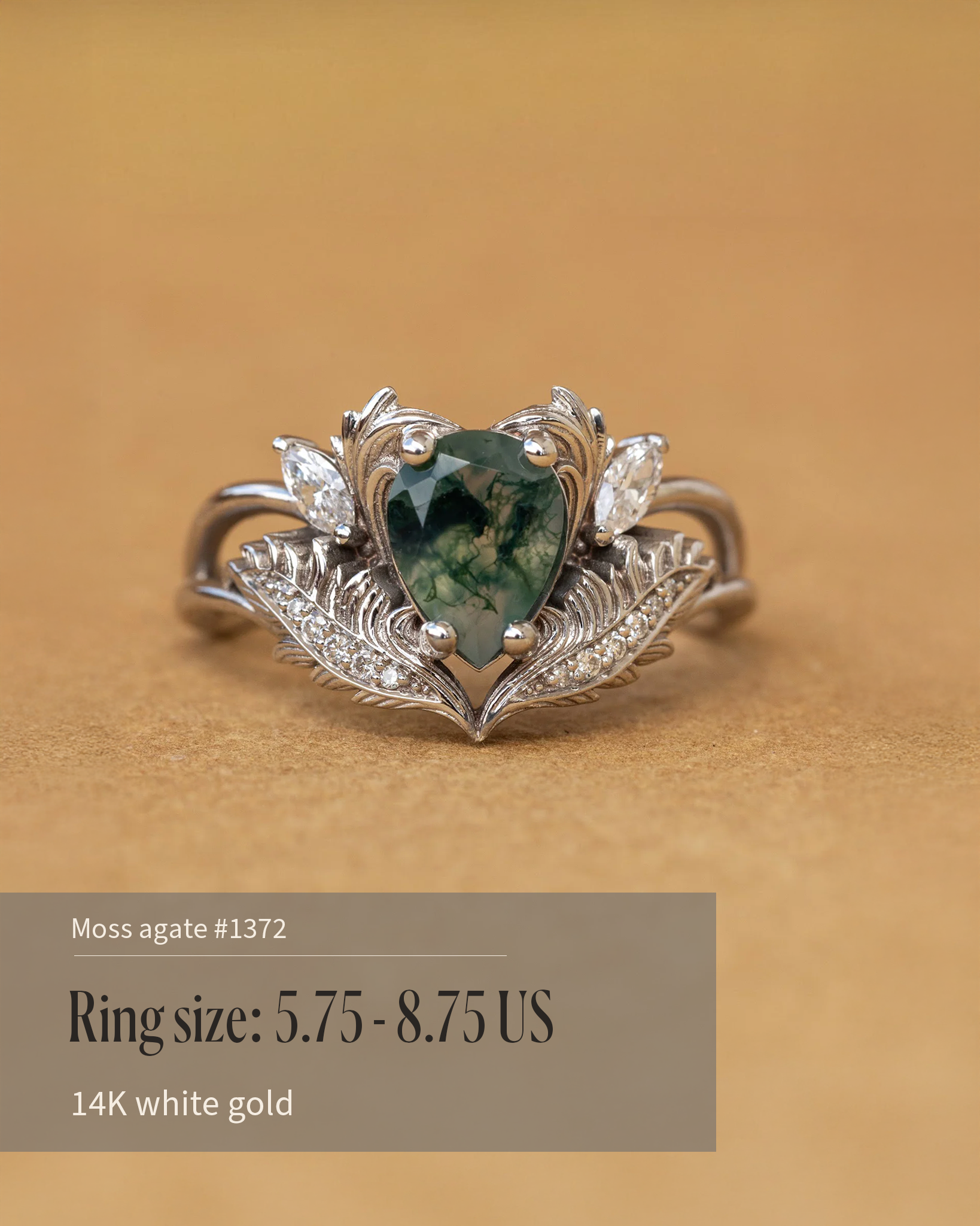 READY TO SHIP Adonis ring in 14K white gold, pear cut moss agate, accent lab grown diamonds, RING SIZES: 5.75 - 8.75 US