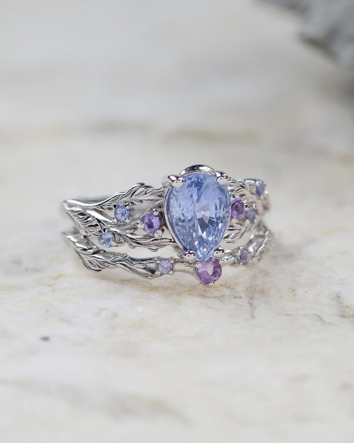 Delicately sculpted, this bridal set would be perfect for alternative engagement ring seekers. You can see Japanese maple leaves wrapping the central gemstone - natural blue sapphire. Adorned with accent purple amethysts & blue tanzanites.