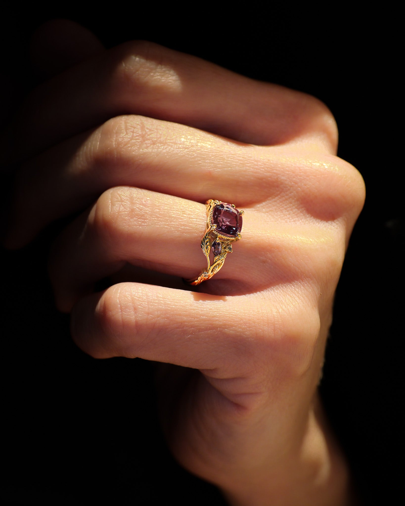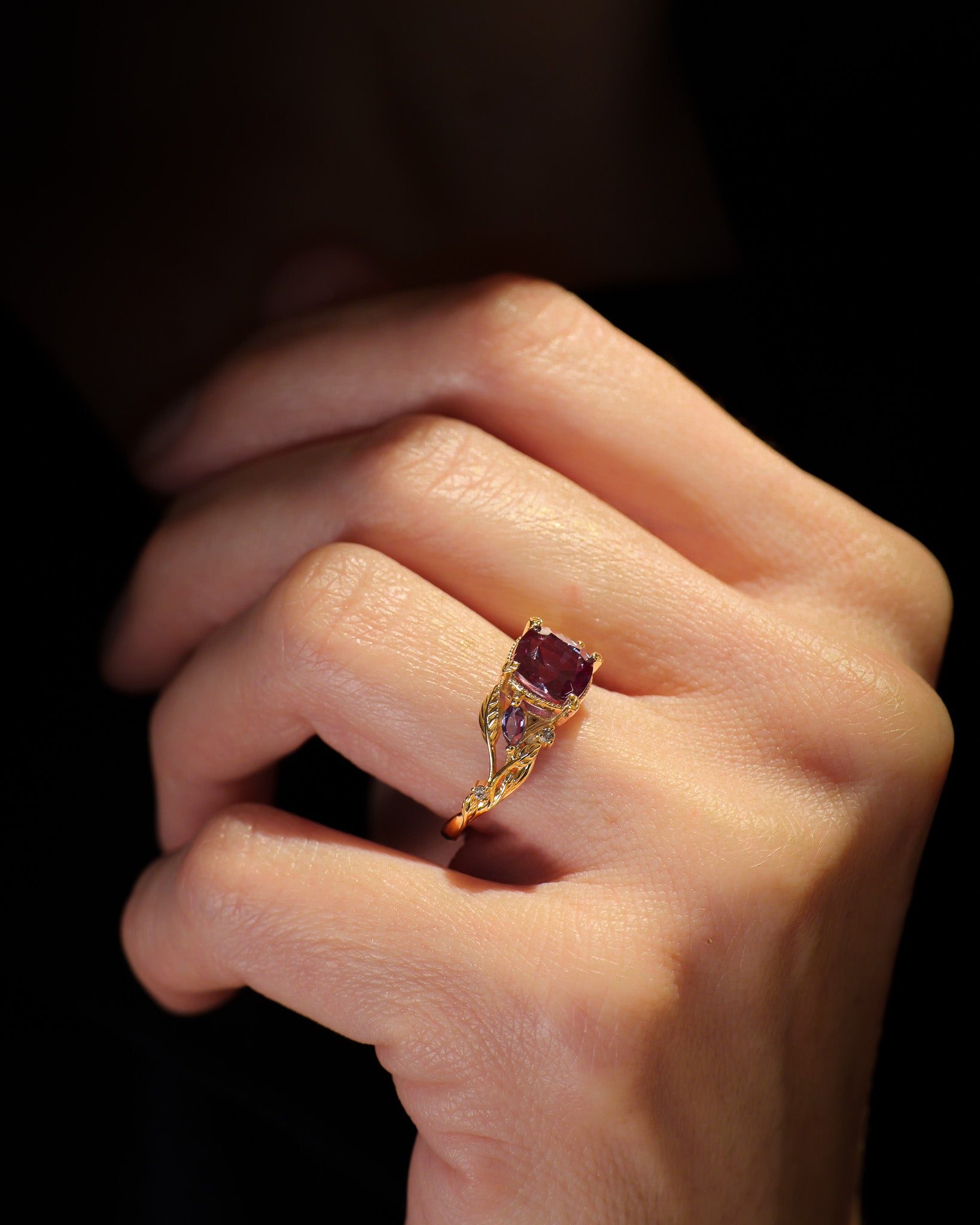Patricia ring shows an intricate design with vines and leaves interlacing naturally. Side gemstones are scattered between twigs - marquise cut gemstones remind us of leaf shapes, and small round cuts look like shiny morning dew. The central gemstone has a beaded frame around it, which adds extra detail.