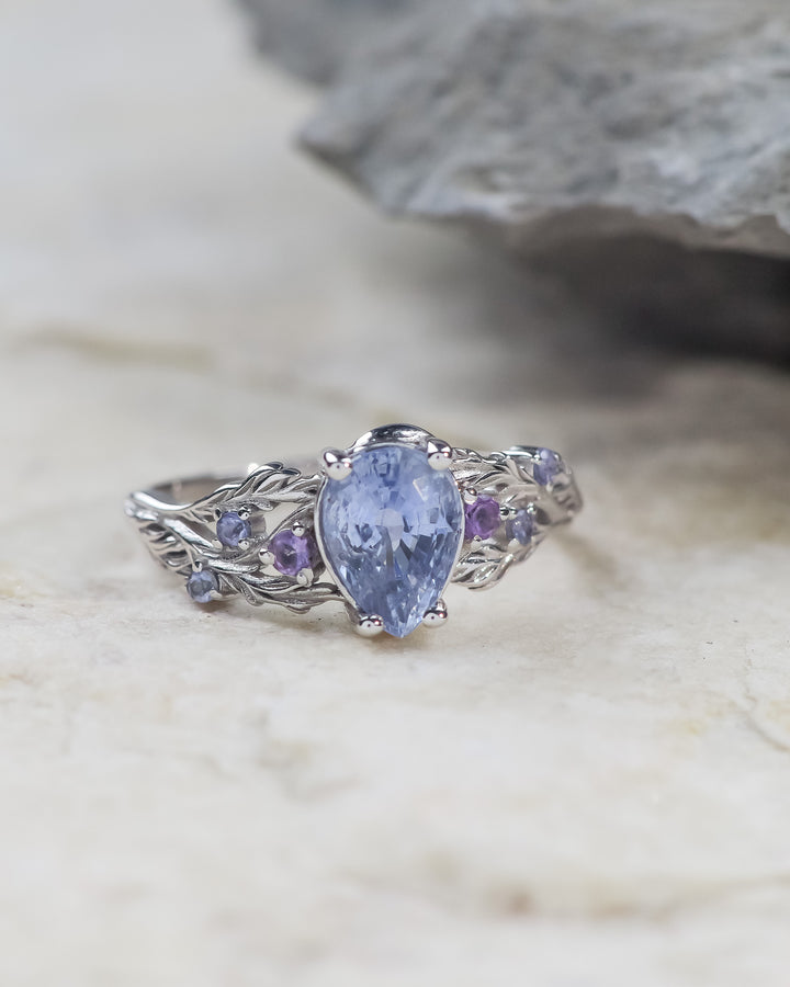 Natural blue sapphire engagement ring with enchanted forest vibes and purple accents / Japanese Maple